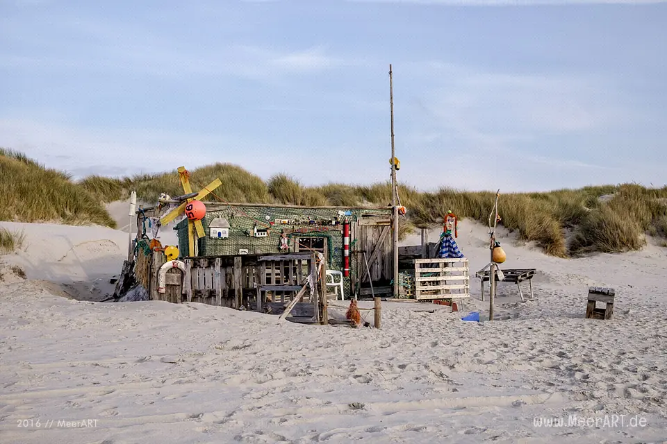 Und trotzdem wurden die Buden früher immer wieder abgefackelt oder mit Traktoren platt gemacht. Manche fielen auch den Herbststürmen zum Opfer. Wie durch Zauberhand entstanden immer wieder neue Hütten. Inzwischen wurden die Bauten am Kniep als Teil des Amrumer Badelebens toleriert. Zumindest bis auf weiteres, denn anscheinend haben sich die Hütten nur auf Amrum durchgesetzt.