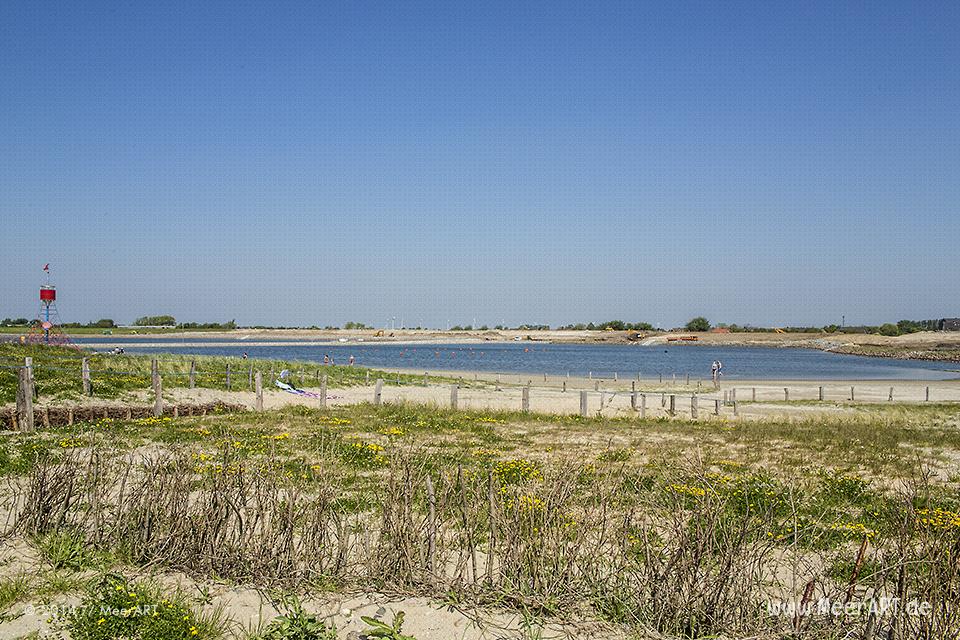 Bevor wir uns endlich der neuen Deichpromenade widmen konnten, wurden wir auf eine harte Geduldsprobe gestellt. Beim Häuschen, wo man seine Kurabgabe entrichtet, gab es eine hitzige Diskussion über die Höhe der Gebühr zwischen einem Rentnerpärchen und der Dame, die die Gästekarten ausgibt. Unglaublich worüber sich die Leute das Leben schwer machen können, und das an einem so traumhaften Tag. Nachdem diese Hürde nun genommen war, konnten wir uns endlich der Waterkant widmen.