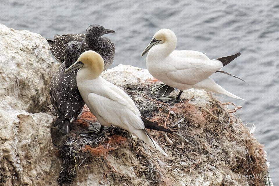 Basstölpel nutzen unter anderem Fischereinetzreste, die im Meer treiben, um das Nest auszustatten. Das wird ihnen leider nur allzu oft zum Verhängnis, denn sie können sich darin verheddern und dadurch tödlich verunglücken.
