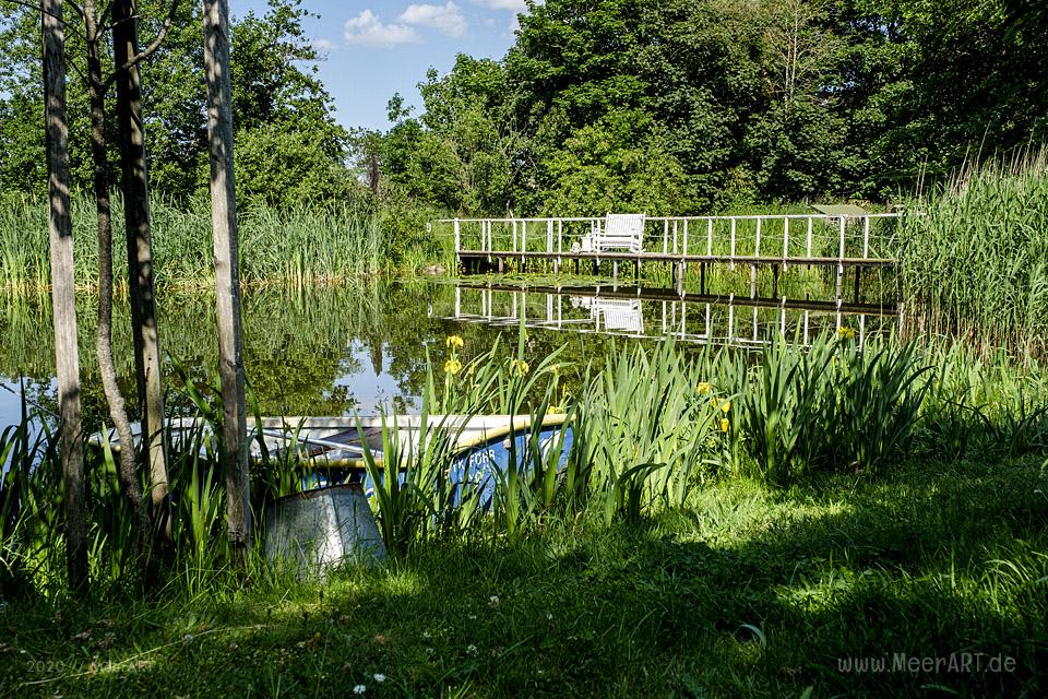Ralph und ich schlenderten noch einmal alleine durch den Garten, um einige der vielen Details einzufangen. Als wir beim Haus am See ankamen, in dem derzeit auch ihre Praxis untergebracht ist, war die Verlockung einfach zu groß und ich setzte mich für einen Augenblick in den Hängestuhl vor dem Haus. Ich ließ meinen Blick über den kleinen See schweifen und stellte mir vor, wie verheißungsvoll der See wohl aussehen mag, wenn die Sonne untergeht.