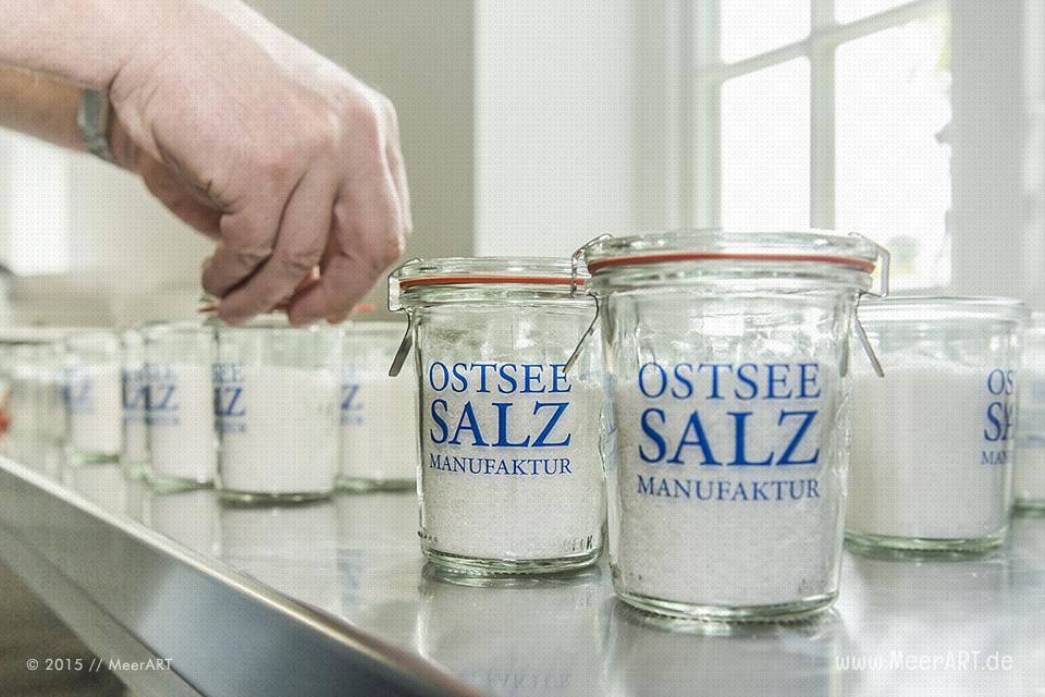 Da aus einer fixen Idee mittlerweile ein Geschäftskonzept geworden ist, wird das Wasser nun nicht mehr mit Eimern, sondern mit 1000 Liter Tanks herbeigeschafft. Das Ostseewasser wird nun bereits beim Abfüllen mit UV-Licht bestrahlt und gefiltert. Da hinter der salzigen Philosophie nicht nur ein regionales, sondern auch ein rein handwerkliches Produkt entstand, ließ er sich von einem Kunstschmied einen Holzofen bauen, der mit heimischen Hölzern befeuert wird. Auf dem Gut Eckhof bei Strande wird das Wasser nun gesiedet, geschöpft und getrocknet. Nach erneuter Reinigung und persönlicher Endkontrolle wird das Salz in kleine Weckgläser abgefüllt, etikettiert und für den Versand fertig gemacht. Alles in Handarbeit, das ist den beiden Betreibern der Ostseesalzmanufaktur ganz wichtig.