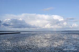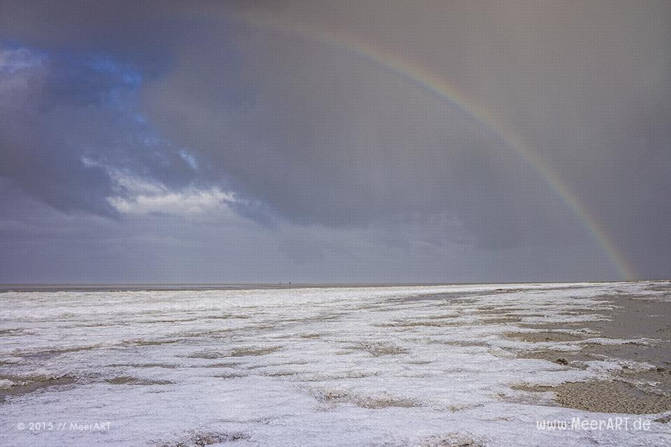 Es war nicht zu übersehen, dass dieser Ort vor kurzem noch mit einer Sturmflut gekämpft hatte. Viele der Dünen waren vom Wasser richtig angefressen. Massen von Sand wurden vom Wasser umhergetragen. Diese Naturgewalten sind schon echt beeindruckend. So wie die Wolken am Himmel, die sich ständig in Bewegung zu mächtigen und bedrohlichen Formationen ausprägten. Plötzlich entstand Richtung Westerhever ein riesiger Regenbogen.